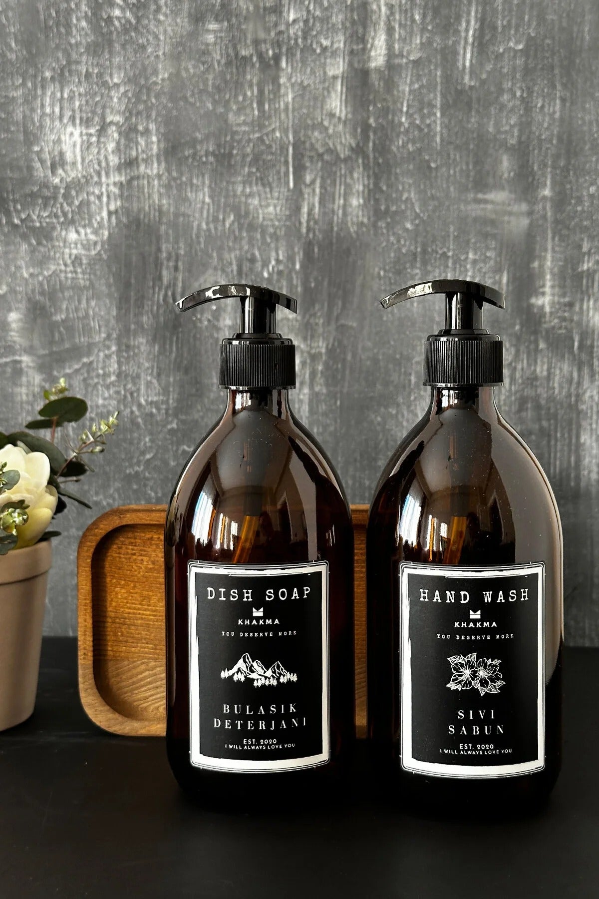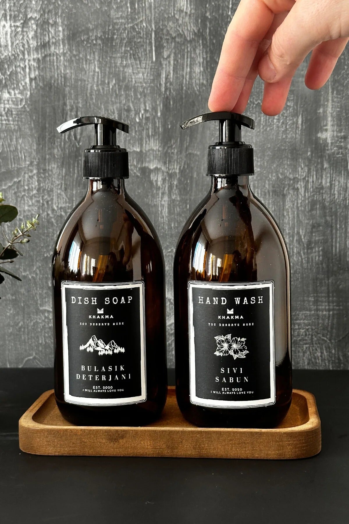 Ahşap Stantlı 2'li Sıvı Sabun Bulaşık Deterjanı Şişesi Queen Sıvı Sabunluk 500ml Ss Hd St