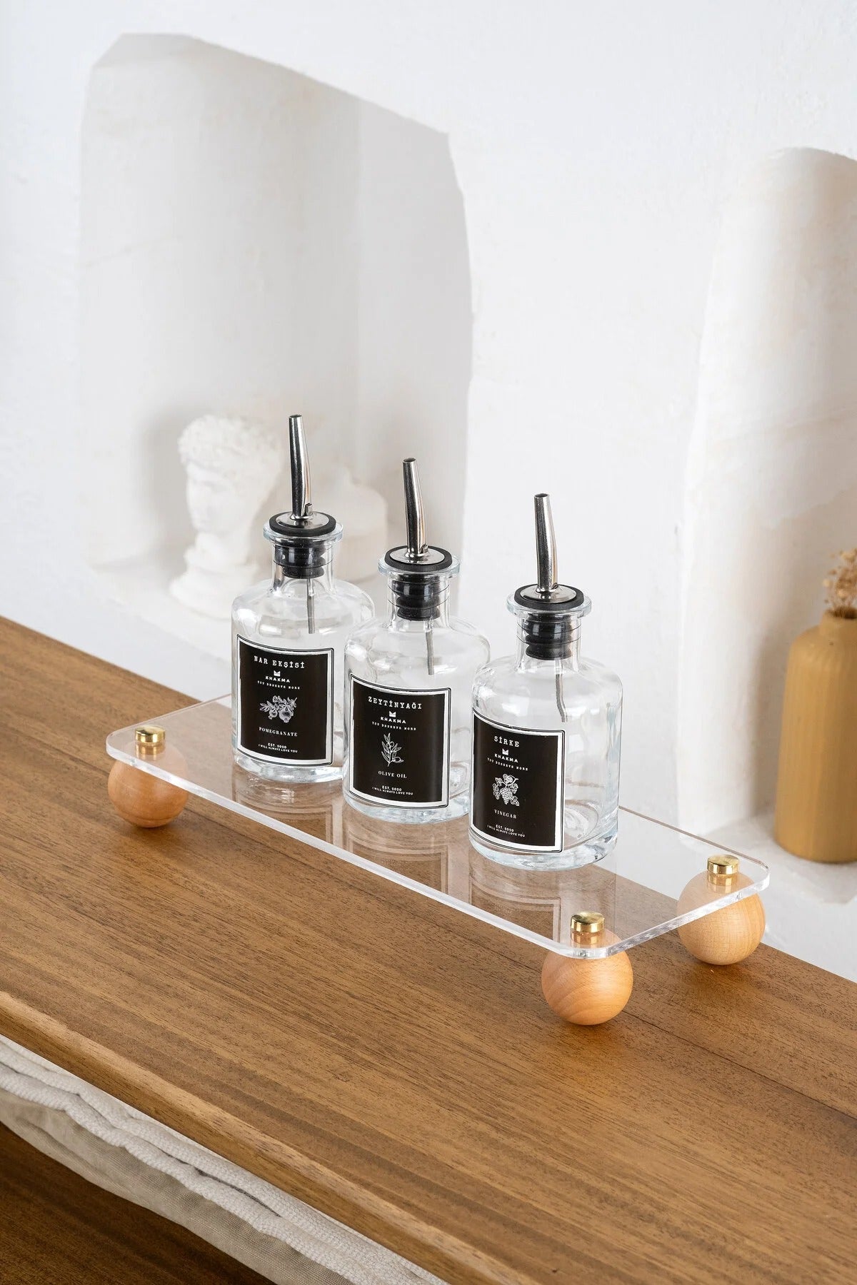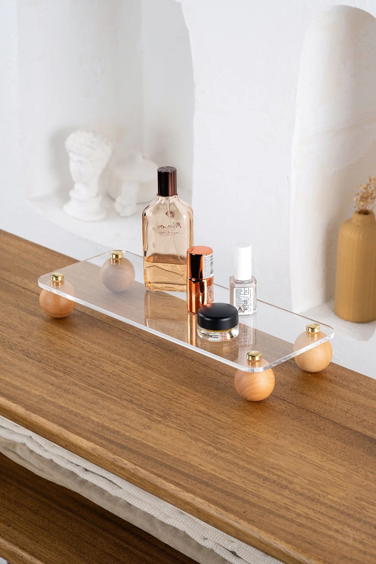 Bu ürün %100 yerli olarak Khakma Home tarafından üretilmektedir. ; ; Ahşap ayaklar doğal kayın ağacından imal edildikten sonra cilalanarak suya karşı dirençli hale getirilmiştir. ; ; Metal kapak parçalar INOX ve GOLD görünüm krom ile kaplanmış şekilde 2 ayrı renk olarak gönderilecektir, dolayısıyla kullanıldığı ortama uyum sağlamak adına İSTER GOLD İSTER KROM RENK olarak kullanılabilir, nem ve sudan zarar görmeyecek şekilde tasarlanmıştır . ; ; Şeffaf Stant 1.sınıf 5mm ithal akrilik pleksi malzeme olup hassas lazer işleme yöntemiyle üretilmektedir. ; CAM DEĞİLDİR. KIRILMAYA KARŞI DİRENÇLİDİR. SUDAN ETKİLENMEZ. ; Bu ürünün temizliğini herhangi bir kimyasal kullanmadan nemli bir bez ile yapabilirsiniz . ; ÖZEL KUTUve ambalajıyla kargoda zarar görmeyecek şekilde tarafınıza gönderimi yapılacaktır. ; Gönül rahatlığıyla HEDİYE olarak alınabilir. ; ; Ürün kargoda zarar görmemesi için DEMONTE olarak, kurulum kılavuzuyla birlikte kendi özel kutusunda gönderilmektedir. Kurulumu çok basittir. ; KULLANIM ALANLARI: ; Banyoda; Sabun, Havlu, Mum, Kişisel bakım ürünlerinin vs. ; ; Mutfakta; Yağdanlık, Baharatlık, çiçek ve diğer mutfak gereçlerinin vs. ; ; Yatak odasında; Parfüm, Mum, Takı, Saat vs. ; ; Antrede; Anahtarlık, Cüzdan vs. ; Ofis, Salon, Oturma Odaları ve Ofis gibi HER ALANDA hem kişisel eşyalarınızı hem de dekoratif objelerinizi düzenlemenize yardımcı olurken aynı zamanda çok şık bir görüntü sağlar. ; Ürün Ölçüleri: En 13cm Boy 33cm Yükseklik 6cm . ;