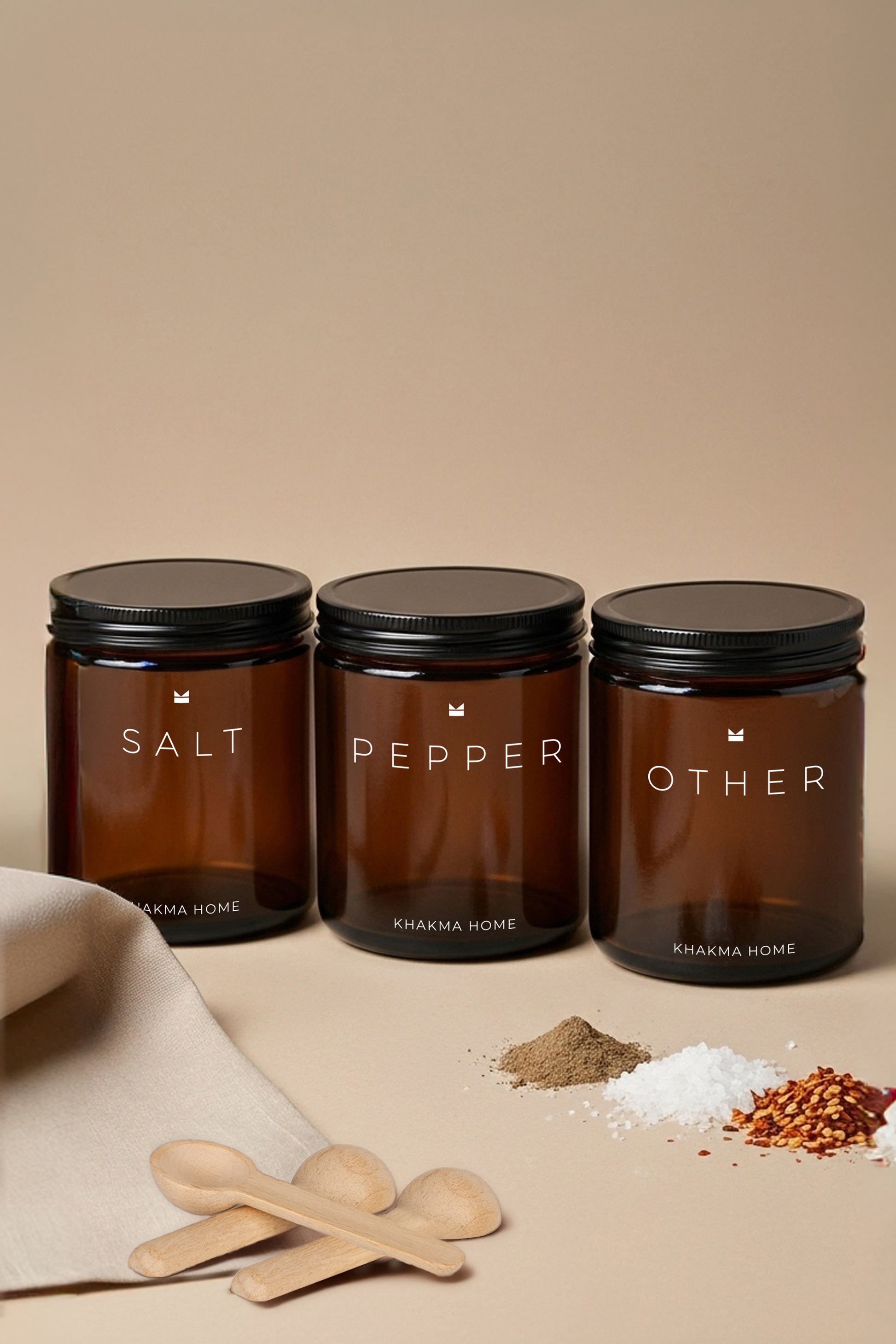 Mutfak estetiğinizi tamamlayan ve baharatlarınıza düzen getiren bu özel tasarım kavanoz setiyle tanışın! “Salt”, “Pepper” ve “Other” yazılı amber cam kavanozlar, hem zarif bir görünüm hem de fonksiyonel kullanım sunar.