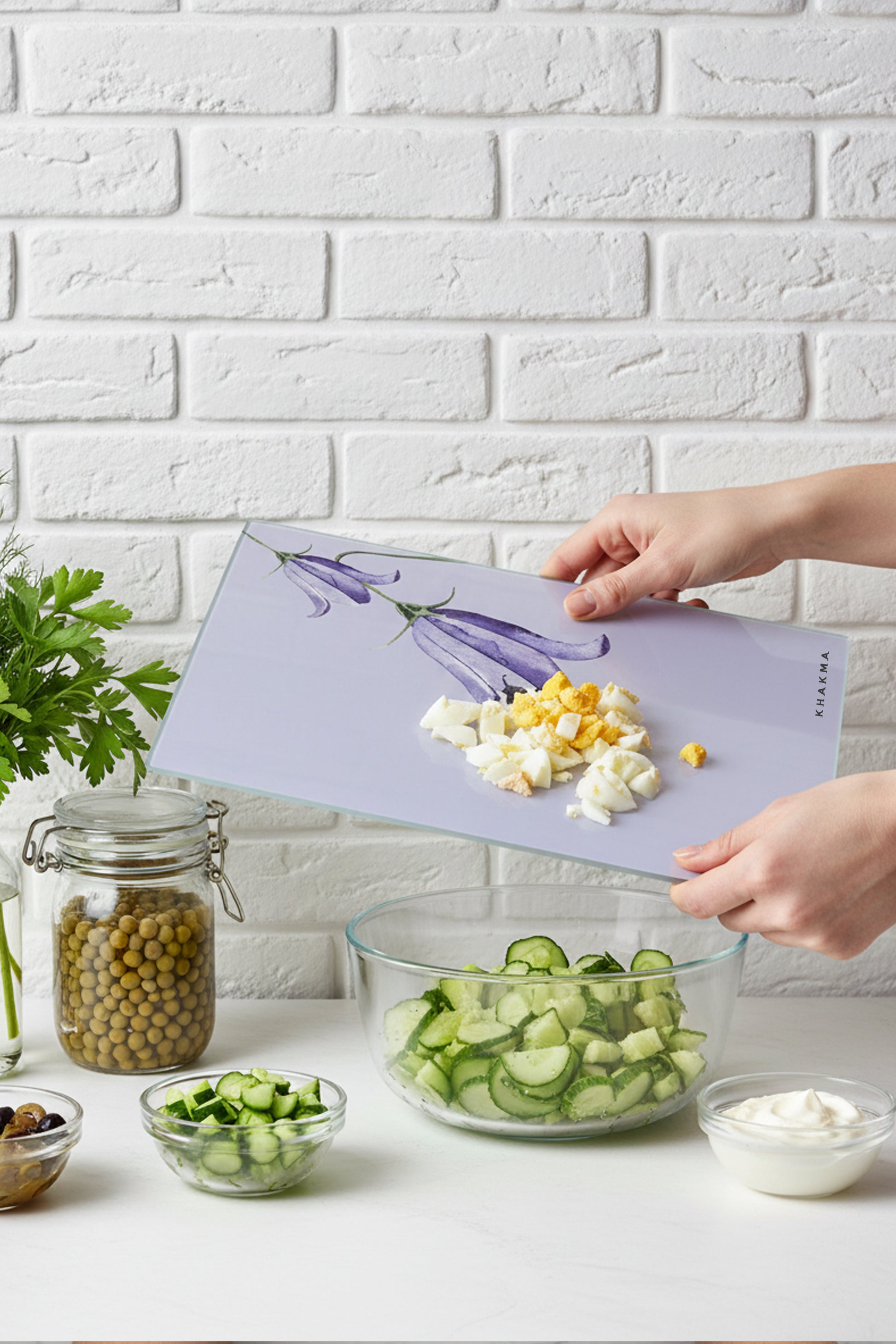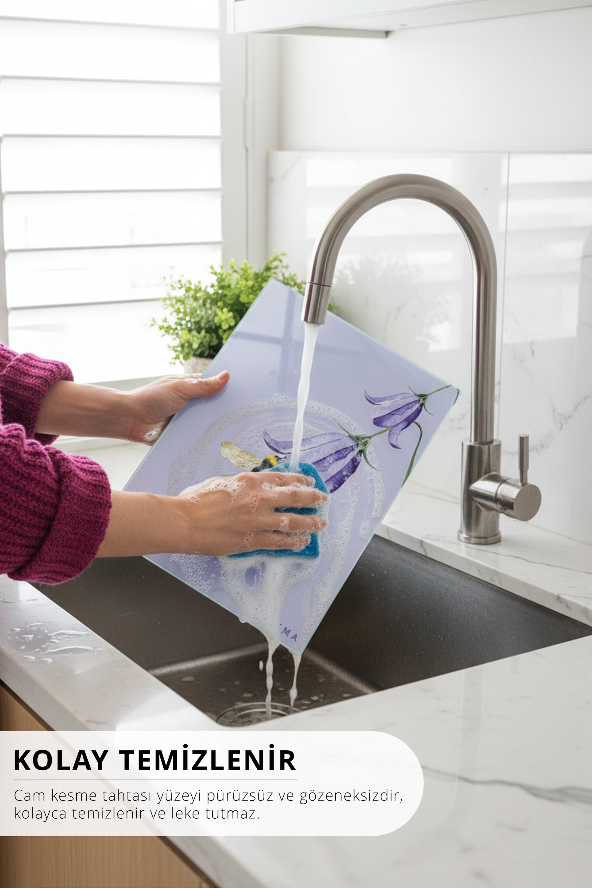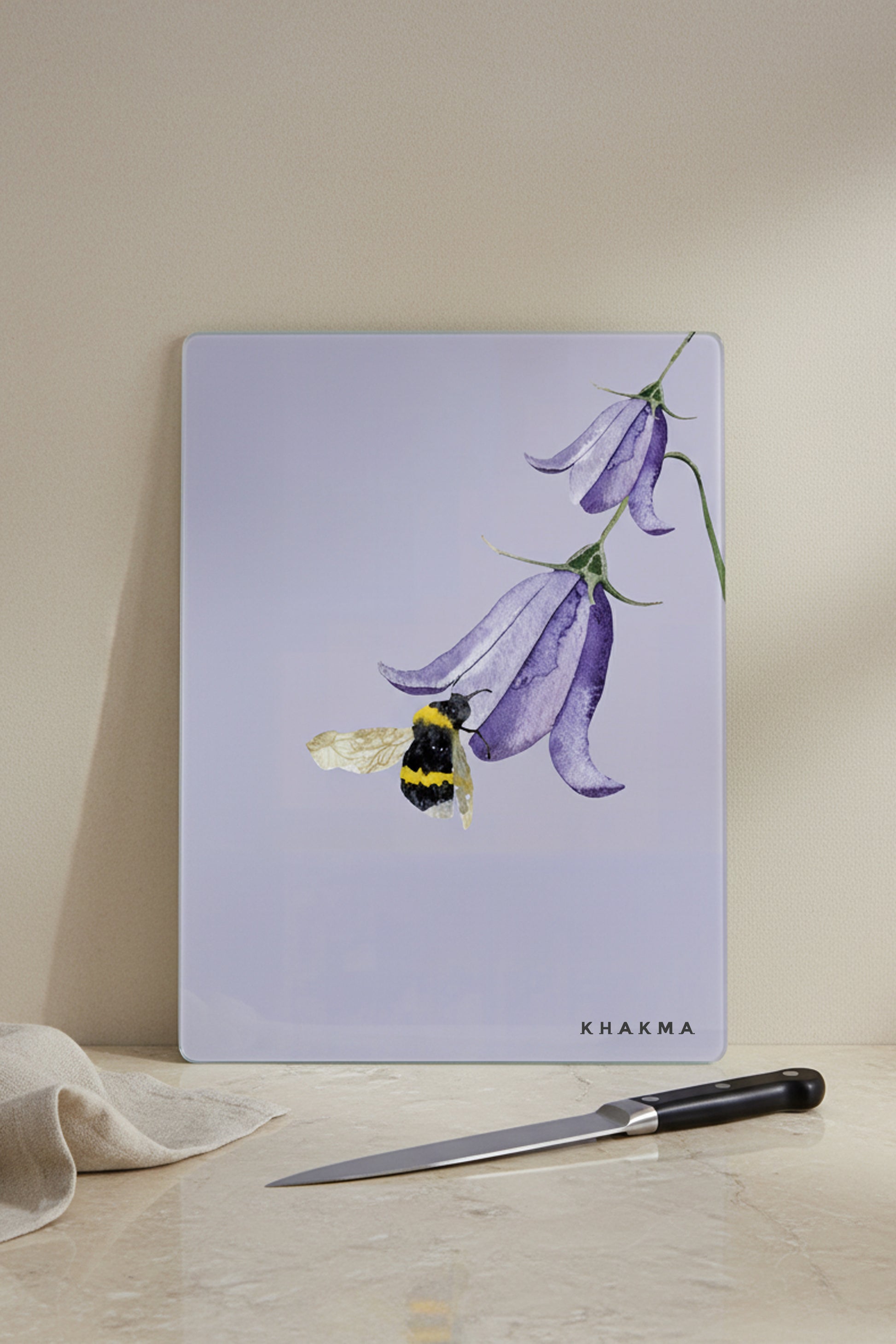 Khakma Home BeeBlossom Cam Kesme Tahtası, pastel tonlardaki arka plan üzerineişlenmiş mor çan çiçeği ve narin bir arı figürüyle hem estetik hem fonksiyonelbir kullanım sunuyor. Mutfakta doğanın huzurunu yaşayın.